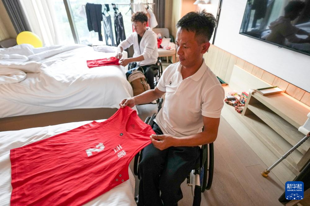 12月12日,西藏轮椅篮球队球员旦增(右)和队友在运动员酒店房间内整理队服。