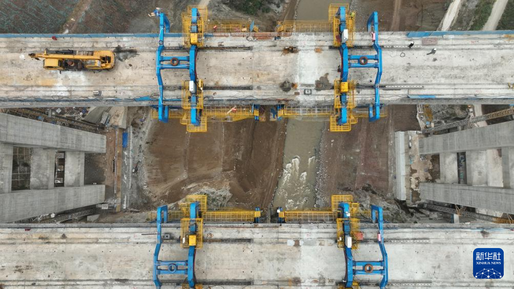 12月16日,在渝昆高铁洛泽河特大桥施工现场,工程技术人员进行合龙后续施工作业(无人机照片)。