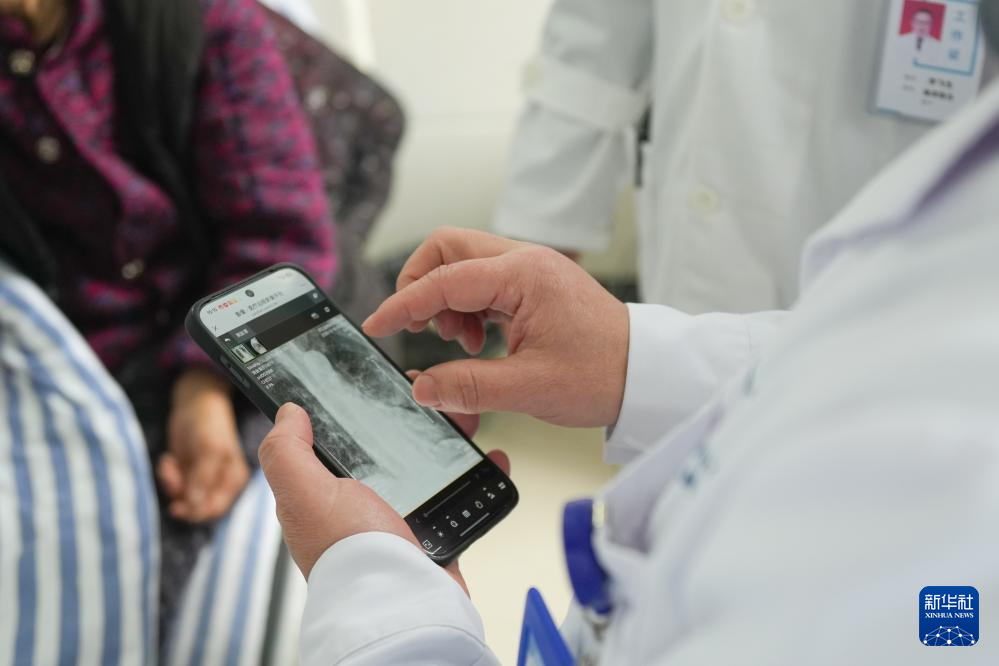 12月19日,在四川省达州市开江县梅家乡卫生院,四川省人民医院派驻川东医院专家杨诚(右一)通过手机在线查看患者的检查报告。