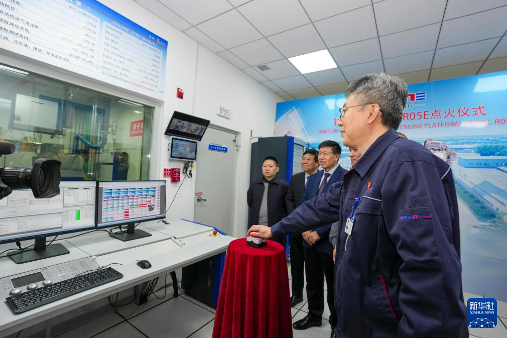 12月19日,哈尔滨东安汽车动力股份有限公司副总经理兼增程动力系统研究院院长赵兴天(右)按下R05E点火启动按钮。
