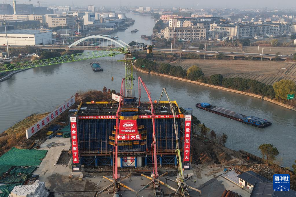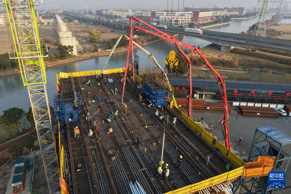 12月20日拍摄的通甬高铁嘉兴特大桥跨杭申线航道矮塔斜拉桥连续梁0号块浇筑施工现场(无人机照片)。