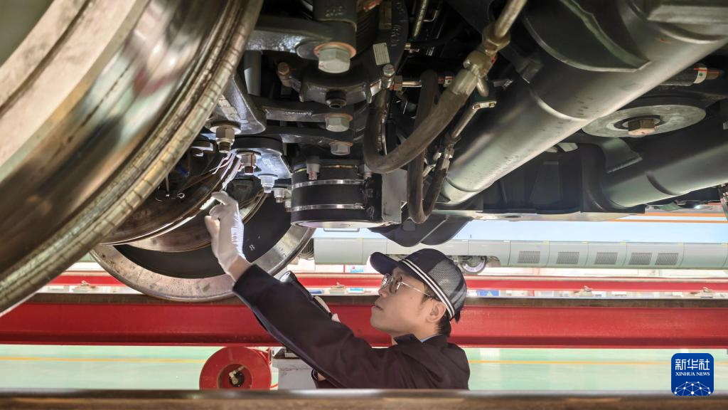 12月21日,中国铁路兰州局集团有限公司兰州车辆段银川动车运用所的工作人员对列车进行检修。他们用专业的坚守,护航每一趟列车的冬日征程,守护万千旅客的平安归途。