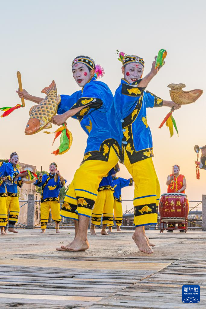 在浙江省温岭市石塘镇里箬村的广场上,村民身着特色服饰,手持乐器,练习国家级非物质文化遗产大奏鼓(2025年4月29日摄)。