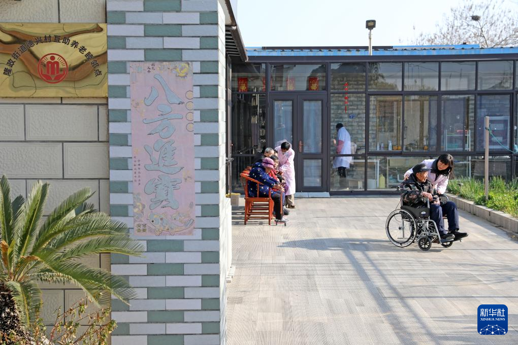12月28日,在江苏省海安高新区隆政街道德兴村亲上亲养老小院,老人在护理人员陪同下晒太阳。