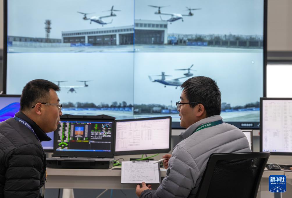 12月28日,科研人员在操控工作台监控无人倾转旋翼飞行器“镧影R6000”的飞行。