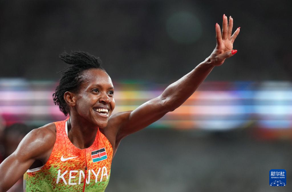 这是2025年9月16日,肯尼亚选手基普页真在2025年世界田径锦标赛女子1500米夺冠后庆祝。