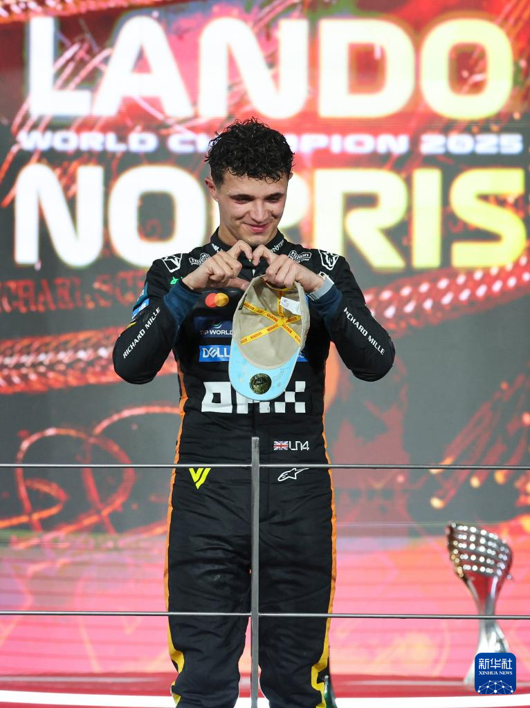 这是2025年12月7日,迈凯伦车队英国车手诺里斯在职业生涯首次加冕F1车手总冠军后庆祝。