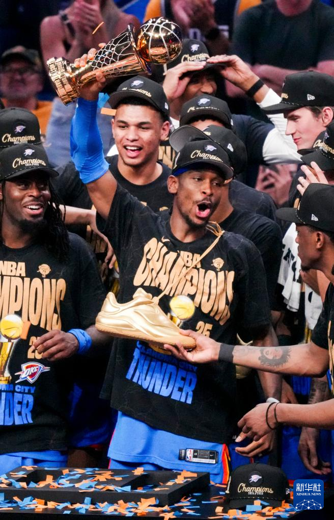 这是2025年6月22日,俄克拉荷马城雷霆队球员吉尔杰斯-亚历山大(前中)当选总决赛最有价值球员(FMVP)。