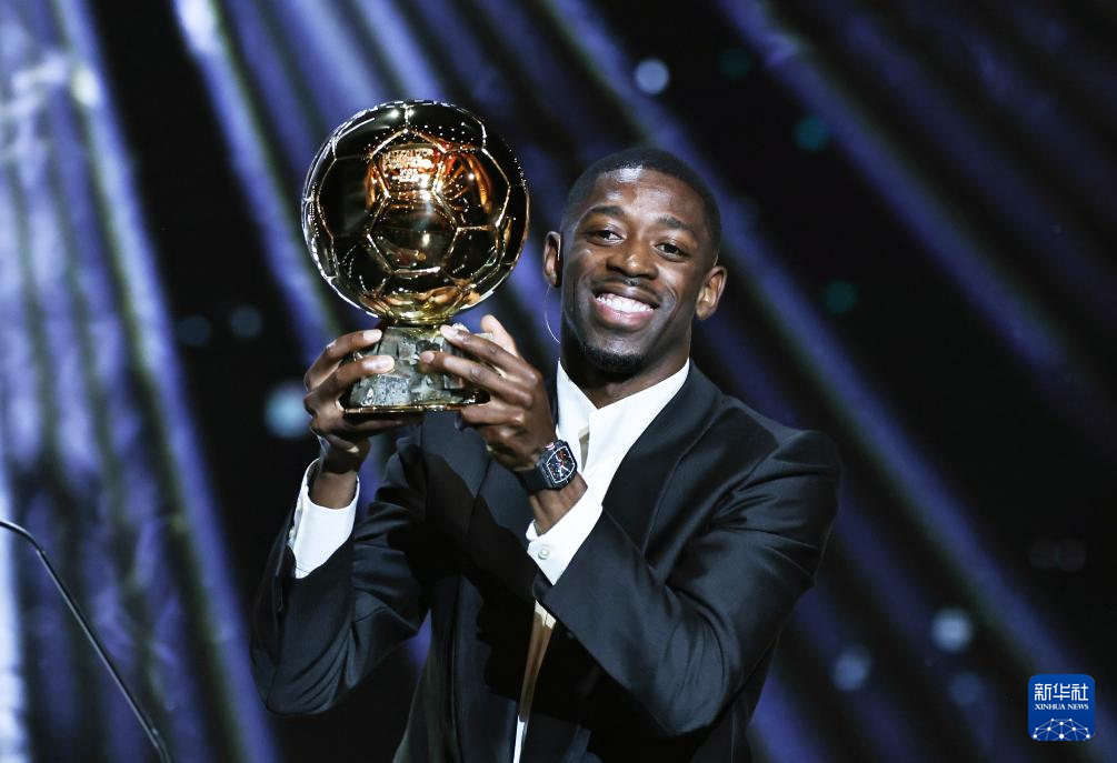 这是2025年9月22日,男足金球奖得主、巴黎圣日耳曼队法国球员登贝莱在2025年金球奖颁奖典礼上与奖杯合影。
