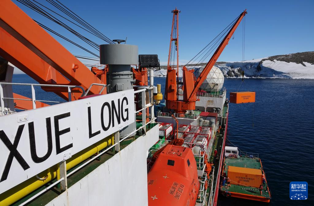 12月29日,“雪龙”号极地科考破冰船在秦岭站海域开展驳船卸货作业。
