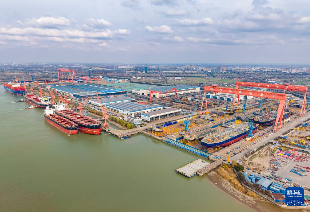 12月27日,在位于江苏省泰州市高港区的泰州三福船舶工程有限公司生产基地,多艘大型船舶在建造中(无人机照片)。