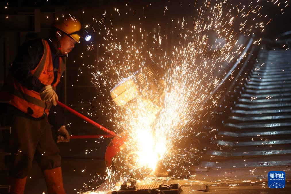 12月30日晚,在位于浙江省湖州市德清县的杭德市域铁路施工现场,中铁十一局工人进行钢轨焊接作业。