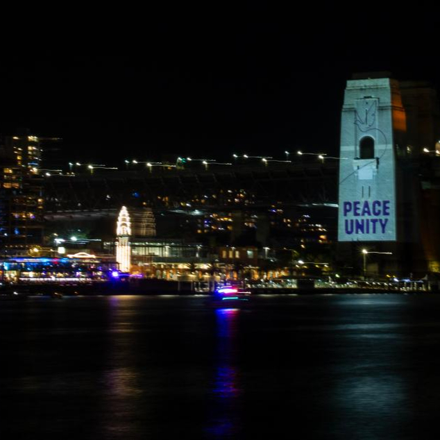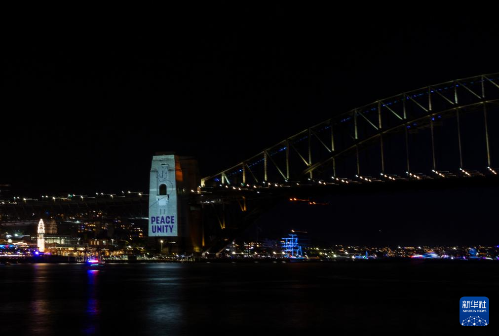 12月31日,澳大利亚悉尼海港大桥被白色灯光点亮,并投射出“和平”“团结”字样及和平鸽图案。
