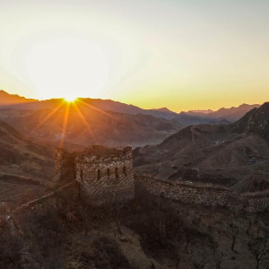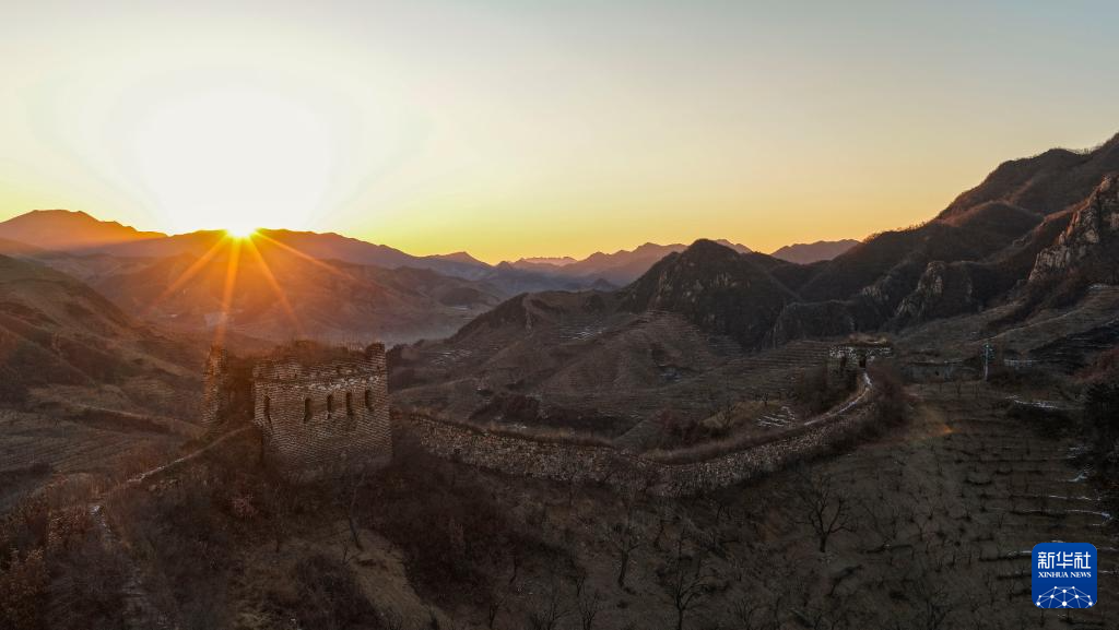 2026年1月1日在河北省迁西县金厂峪镇拍摄的朝阳下的榆木岭长城(无人机照片)。