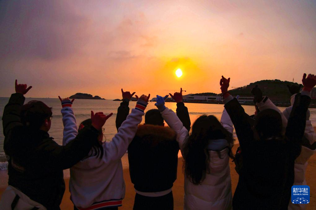 2026年1月1日,游客们在山东省威海市半月湾海水浴场迎接新年第一缕阳光。