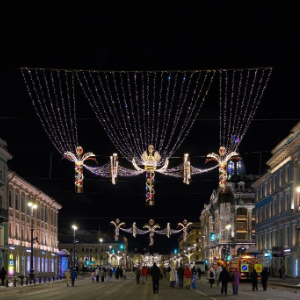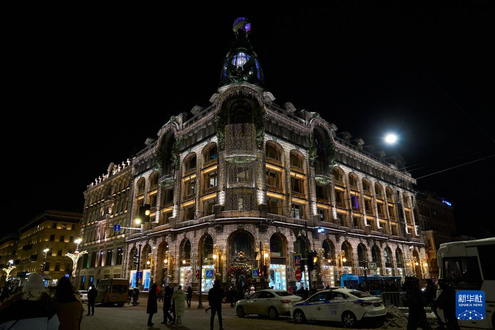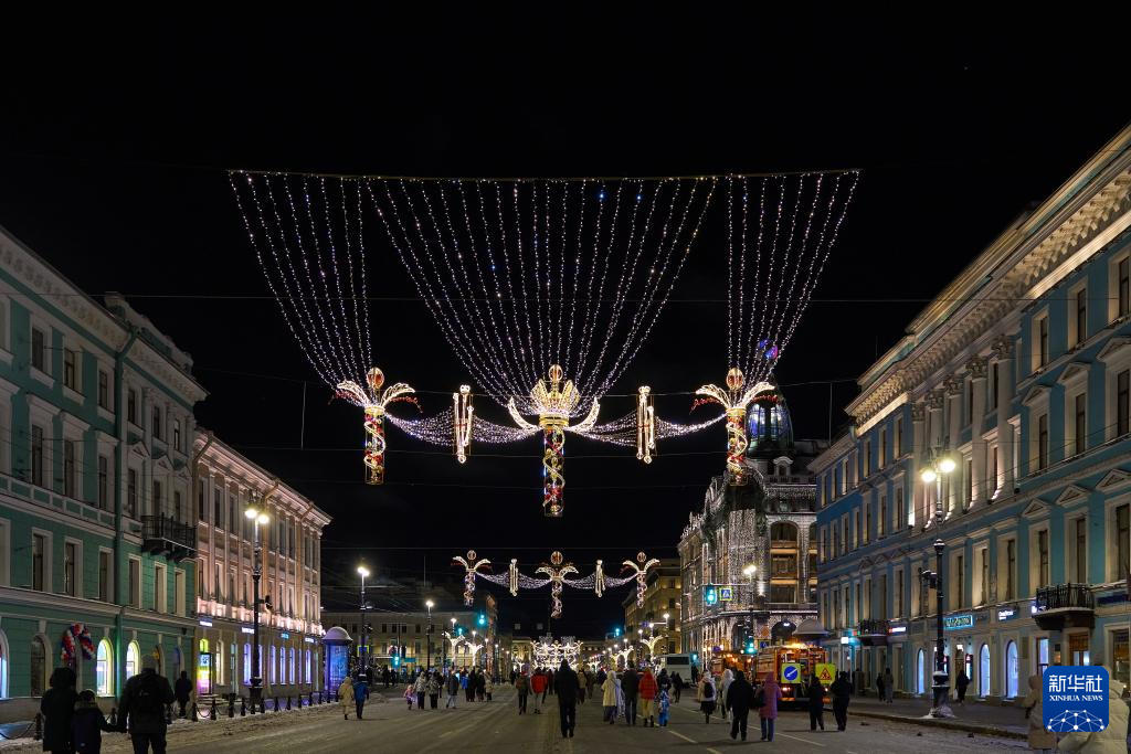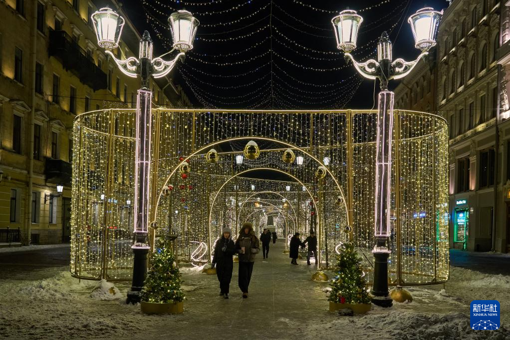 2025年12月31日,俄罗斯圣彼得堡的涅瓦大街点亮灯饰,庆祝新年的到来。