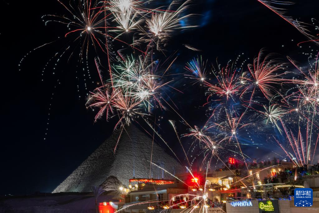 2026年1月1日凌晨,新年烟花在埃及吉萨金字塔群周边绽放。