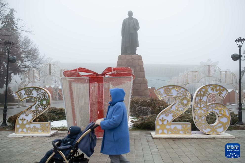 2026年1月1日,在哈萨克斯坦阿拉木图,市民经过新年艺术装置。