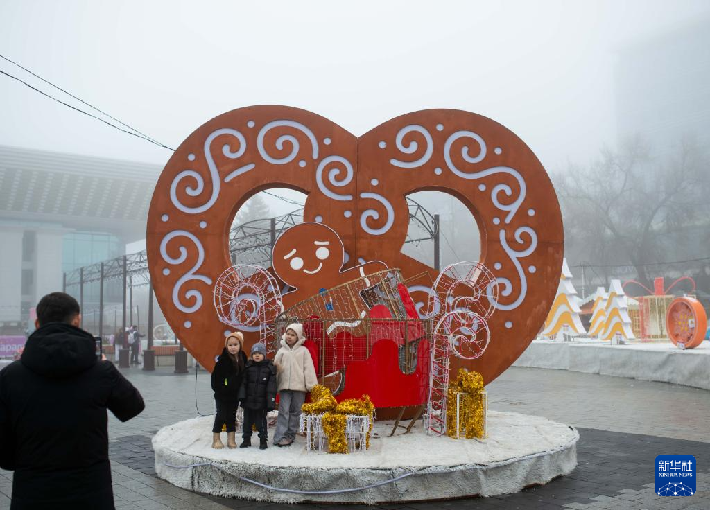 2026年1月1日,在哈萨克斯坦阿拉木图,孩子们在新年艺术装置前留影。