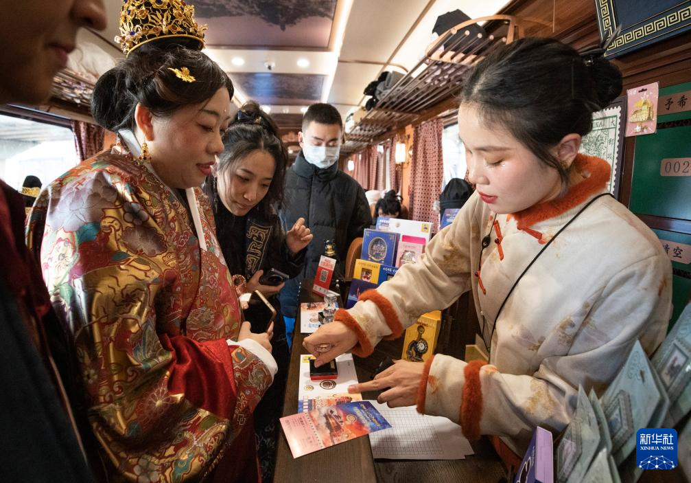2026年1月1日,旅客在列车上购买纪念封与明信片。