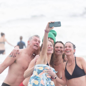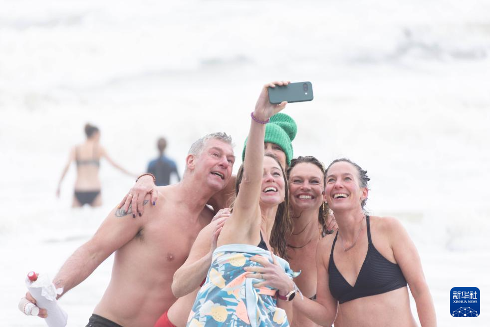 1月1日,人们在荷兰布卢门达尔参加冬泳活动时自拍。