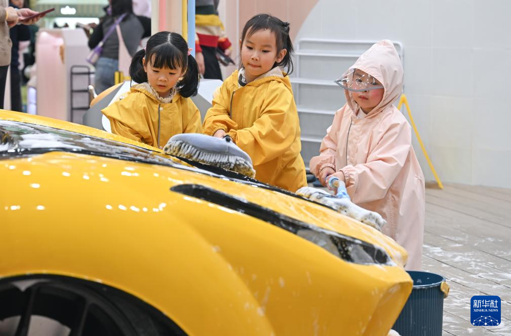 1月2日,在重庆两江新区一商场内,小朋友体验洗车乐趣。