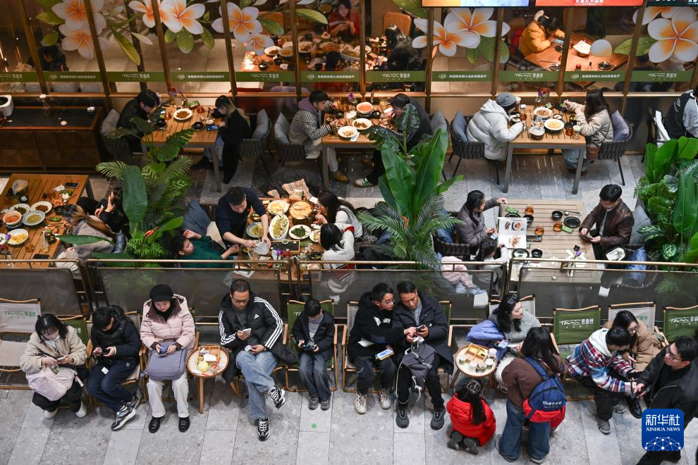 1月2日,在重庆两江新区一商场内,市民在餐饮区排队等待用餐。