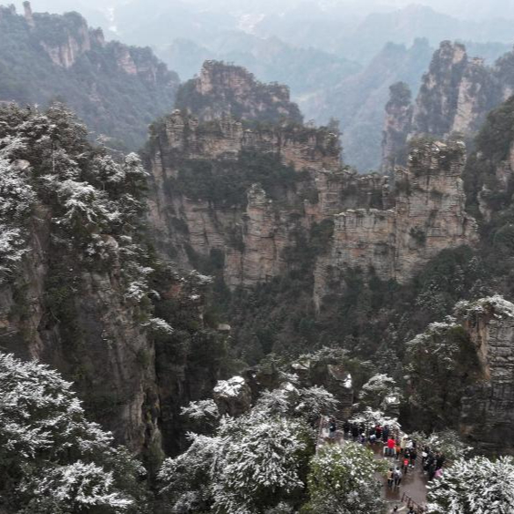 元旦假期第二天,许多游客来到湖南张家界国家森林公园登高观景、望山赏雪。