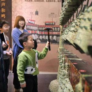 1月3日,小游客在中国考古博物馆互动展区参加仿古编钟的敲击体验活动。