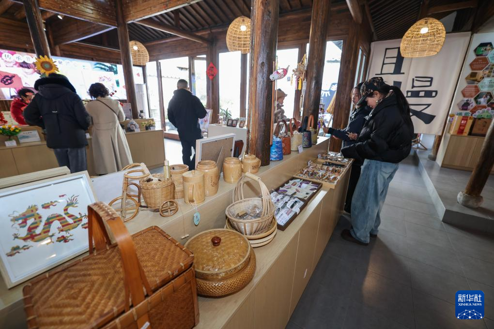 1月8日,游客在坡阳古街一家传统手工艺店里选购商品。