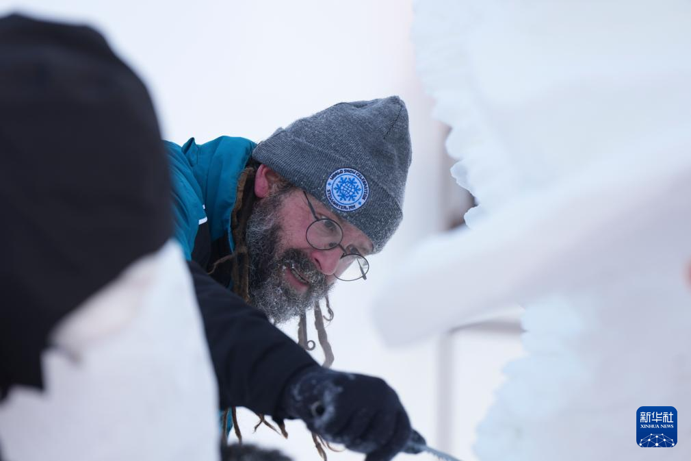 1月9日,俄罗斯阿穆尔斯克队参赛选手在进行雪雕作品《自由的幻象》收尾工作,作品最终获得最佳技巧奖。