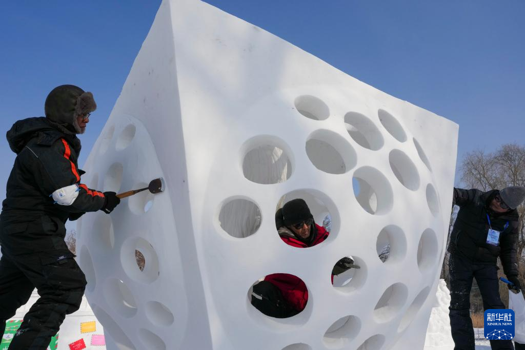 1月9日,中国一队参赛选手在进行雪雕作品《噬》收尾工作,作品最终获得三等奖。