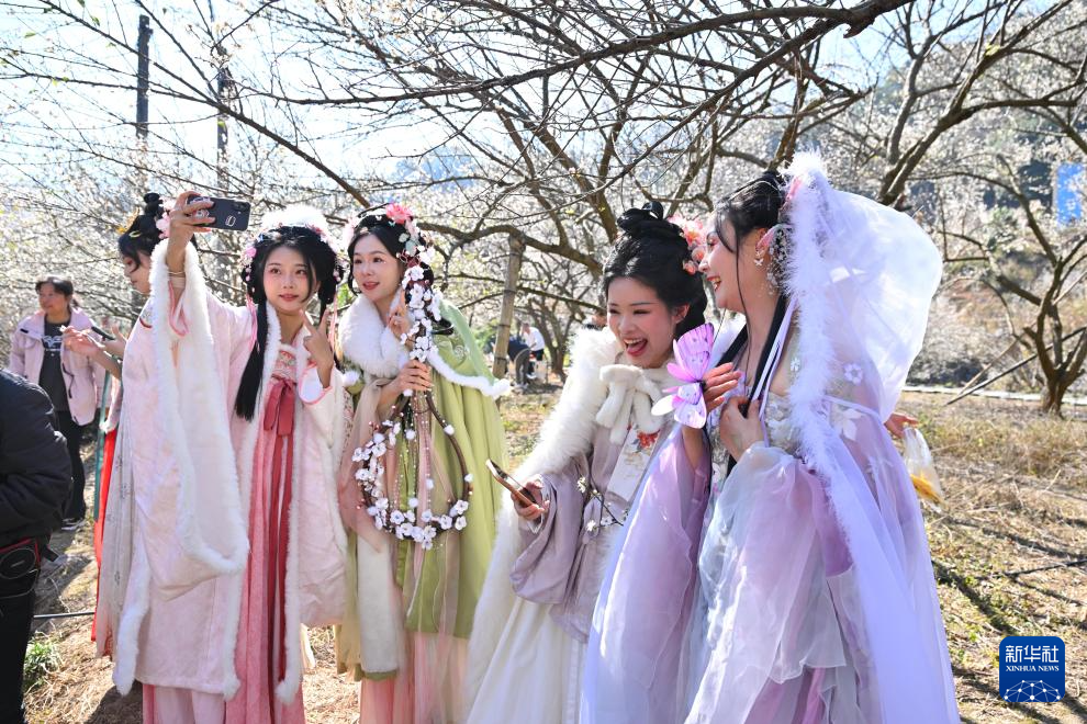 1月10日,一群穿着古装的女孩在福建省永泰县葛岭镇文埕湾的梅园游览。