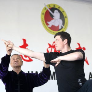 1月10日,武师王志海(左)纠正一名俄罗斯武术爱好者的动作。