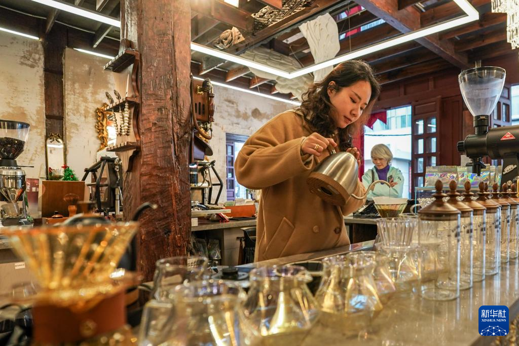 1月13日,在翠湖边的一家咖啡馆里,工作人员为客人制作咖啡。这家咖啡店由一栋清朝老宅改造而成,已有百年历史。