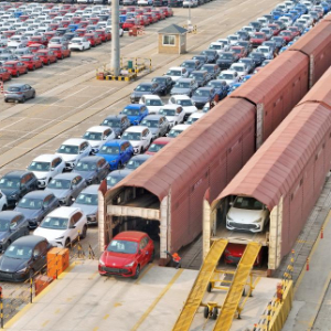 1月14日,在山东港口烟台港,国产汽车从商品车班列中驶出到码头集结等待装船出口(无人机照片)。