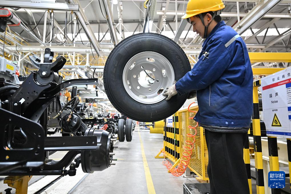 2025年12月12日,在河南省商丘市豫商经济技术开发区一家新能源汽车企业,工人在新能源轻卡车生产线上赶制产品订单。
