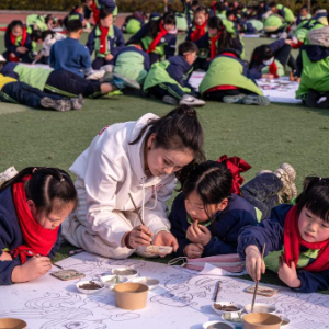 1月14日,四川省自贡市荣县树人小学校操场上,千余名师生共同在巨型“马”字轮廓的画布上创作,以纸绘、陶板绘等形式画出各式生肖马。