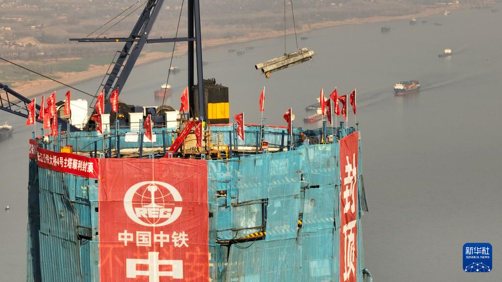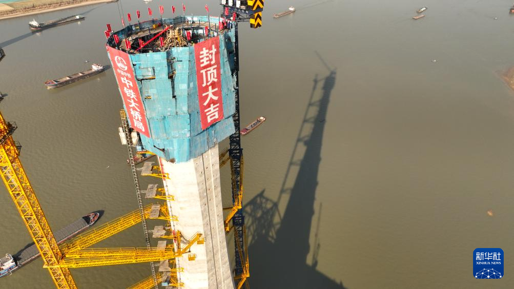 1月15日拍摄的封顶完成的池州长江公铁大桥南主塔(无人机照片)。