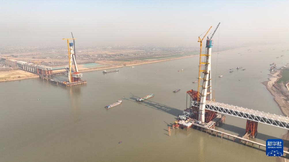 1月14日拍摄的池州长江公铁大桥施工现场。画面左侧为南主塔(无人机照片)。