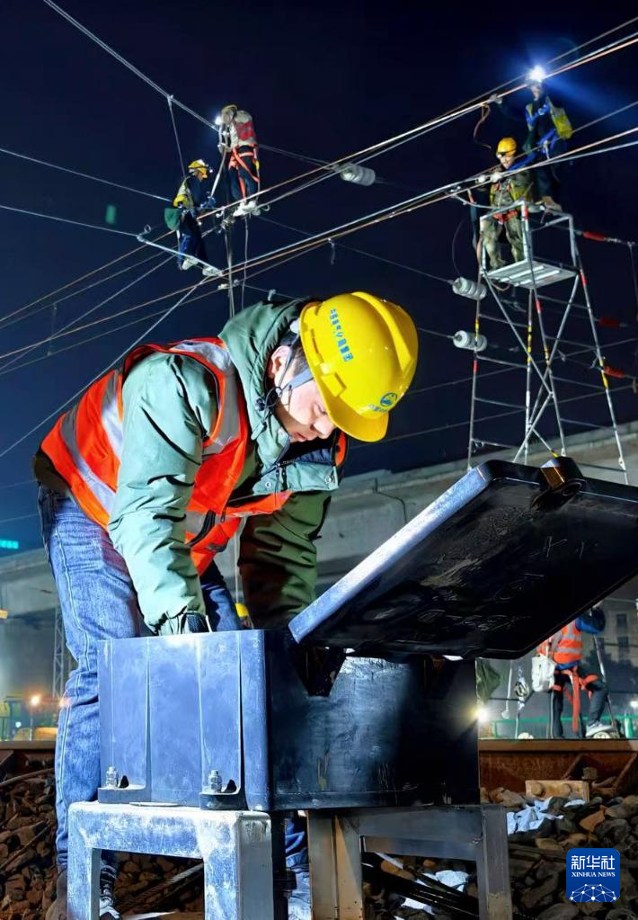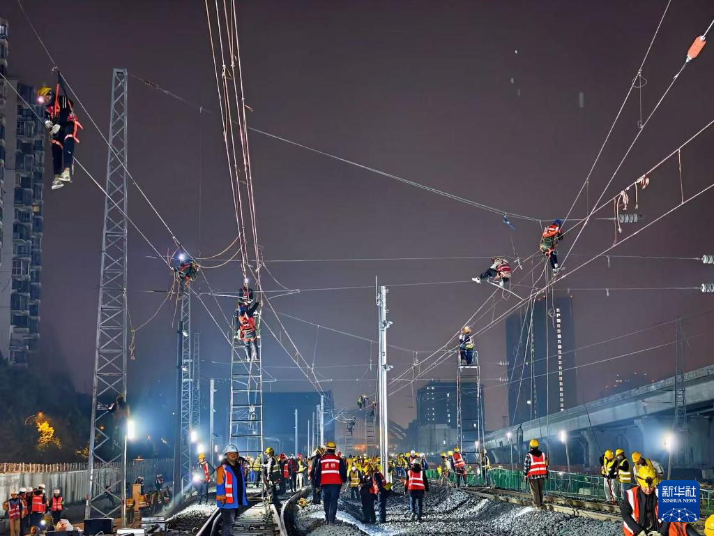 1月16日,中铁电气化局施工人员在进行接触网施工。