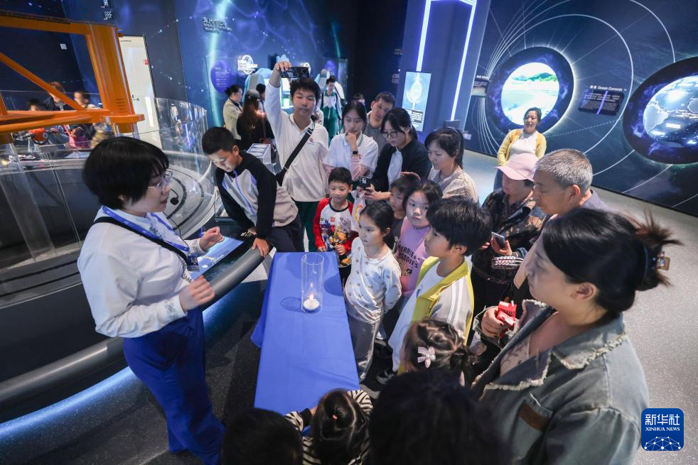 1月15日,海南科技馆工作人员给游客演示科学小实验。