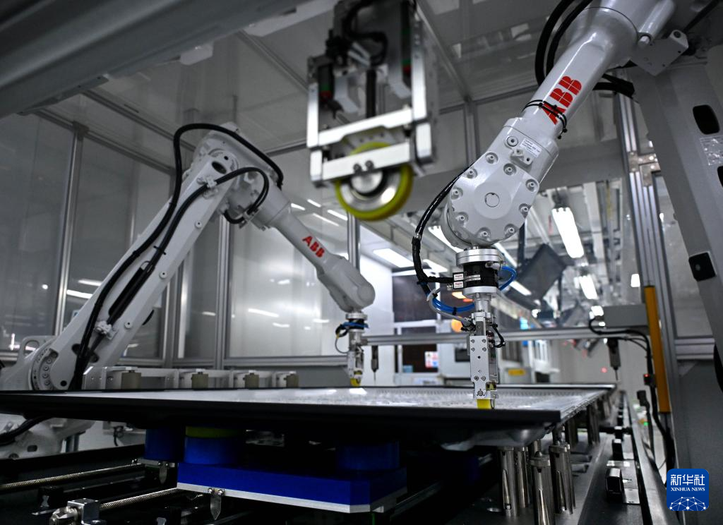 工业机器人在海信视像青岛工厂智能装配线上忙碌(1月13日摄)。
