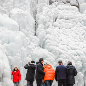 适逢周末,河北省承德市兴隆县青松岭镇石门台村附近的天然冰瀑景观吸引众多游客前来观赏游玩。
