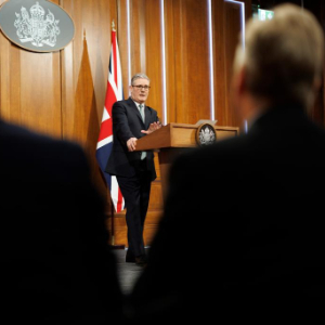 1月19日,英国首相斯塔默在伦敦举行的新闻发布会上讲话。