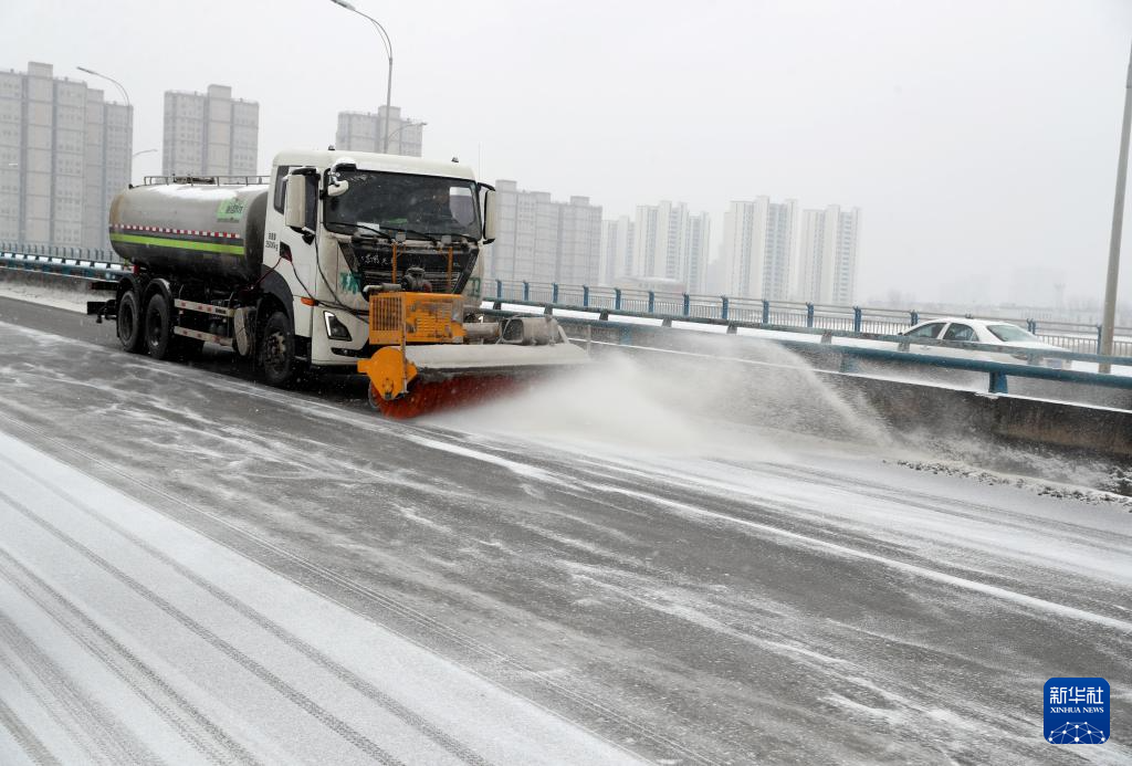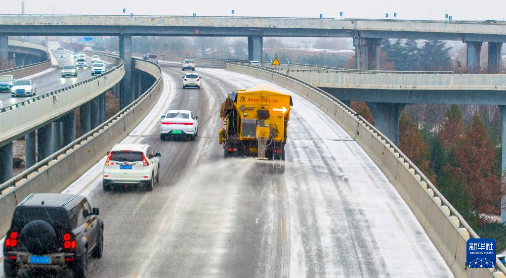 1月19日,在河南省洛阳市古王立交,市政集团车辆对道路进行撒布融雪剂作业(无人机照片)。