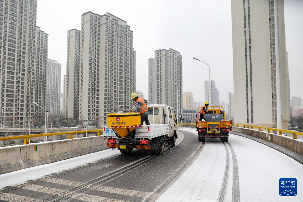 1月19日,安徽省淮北市市政工程管理处的工作人员在撒盐除雪。