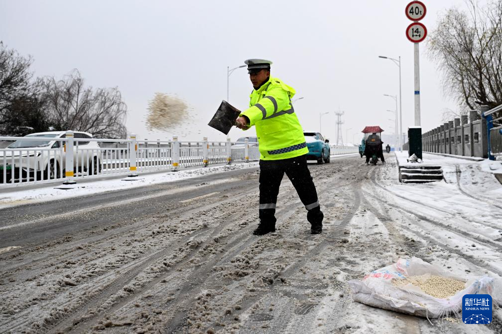 1月19日,在安徽省亳州市灵津渡大桥,亳州市公安局交管支队谯城魏武大队花戏楼中队的交警在抛撒融雪剂除雪。