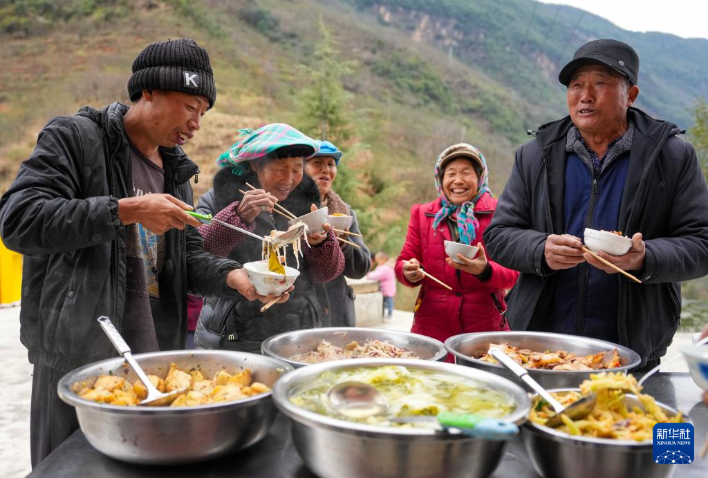 1月20日,巧家县包谷垴乡红石岩村村民在村委会临时安置点吃中午饭。