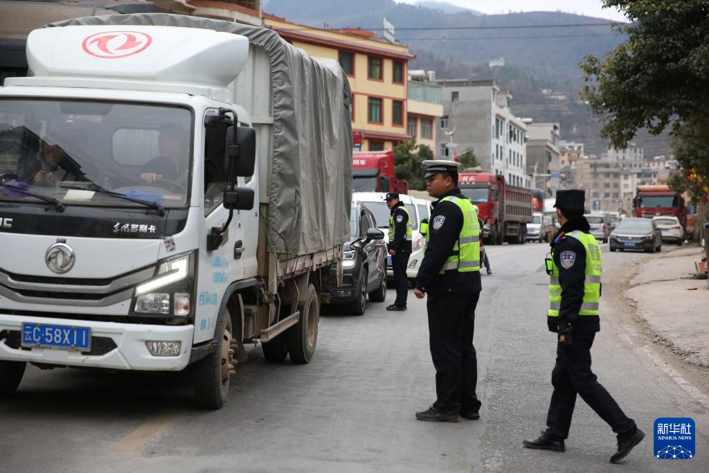 1月20日,民警在巧家县老店镇路口疏导交通。
